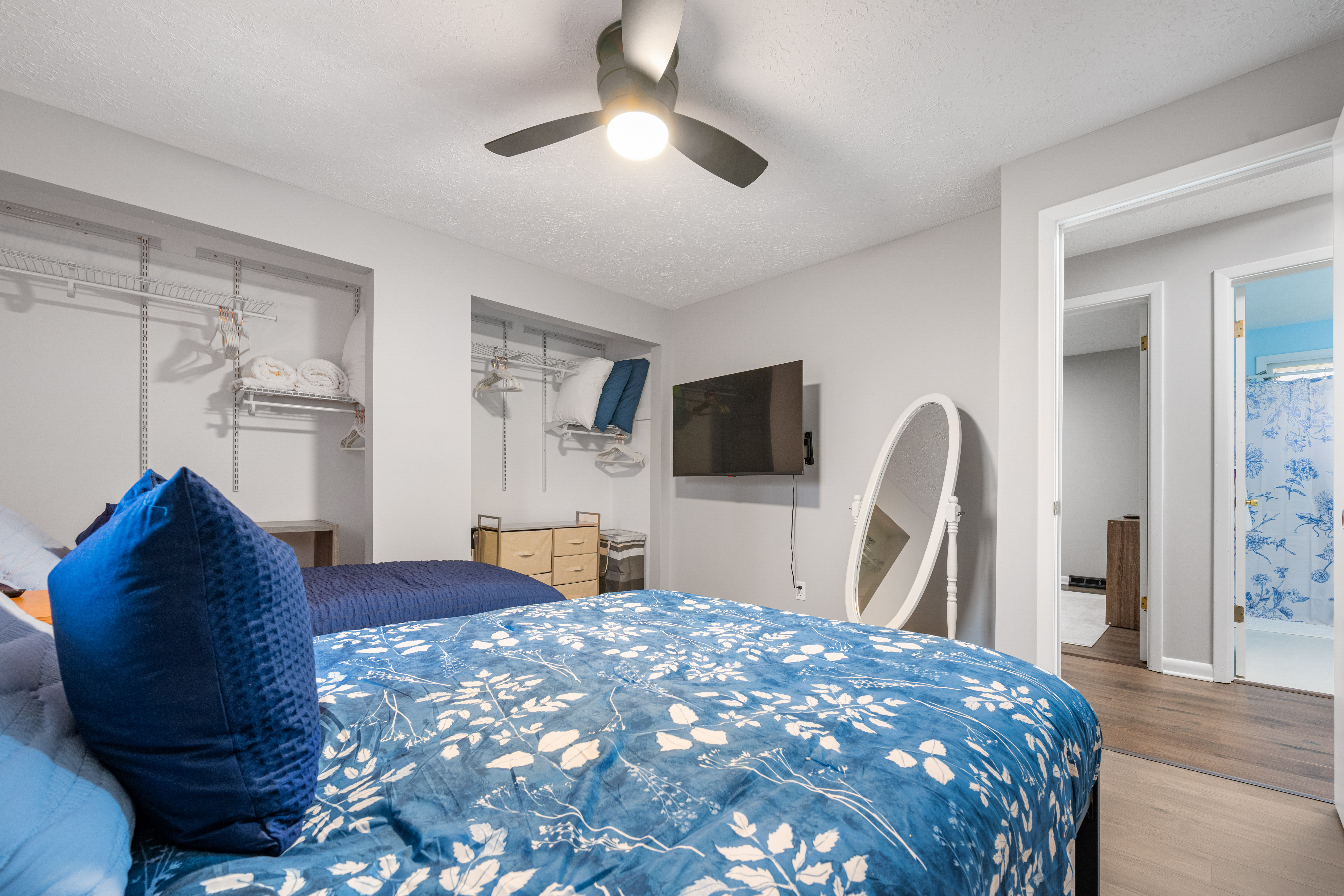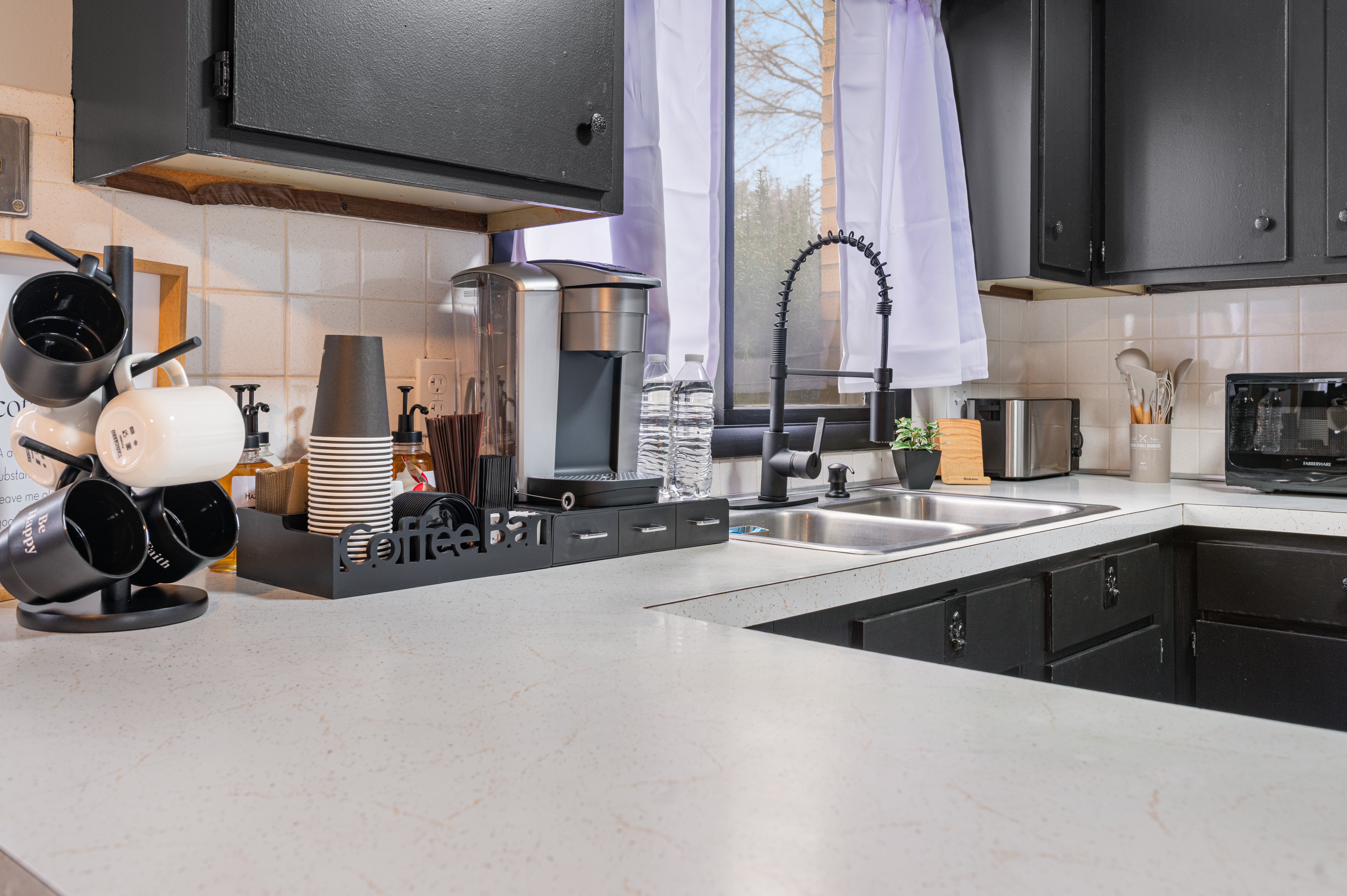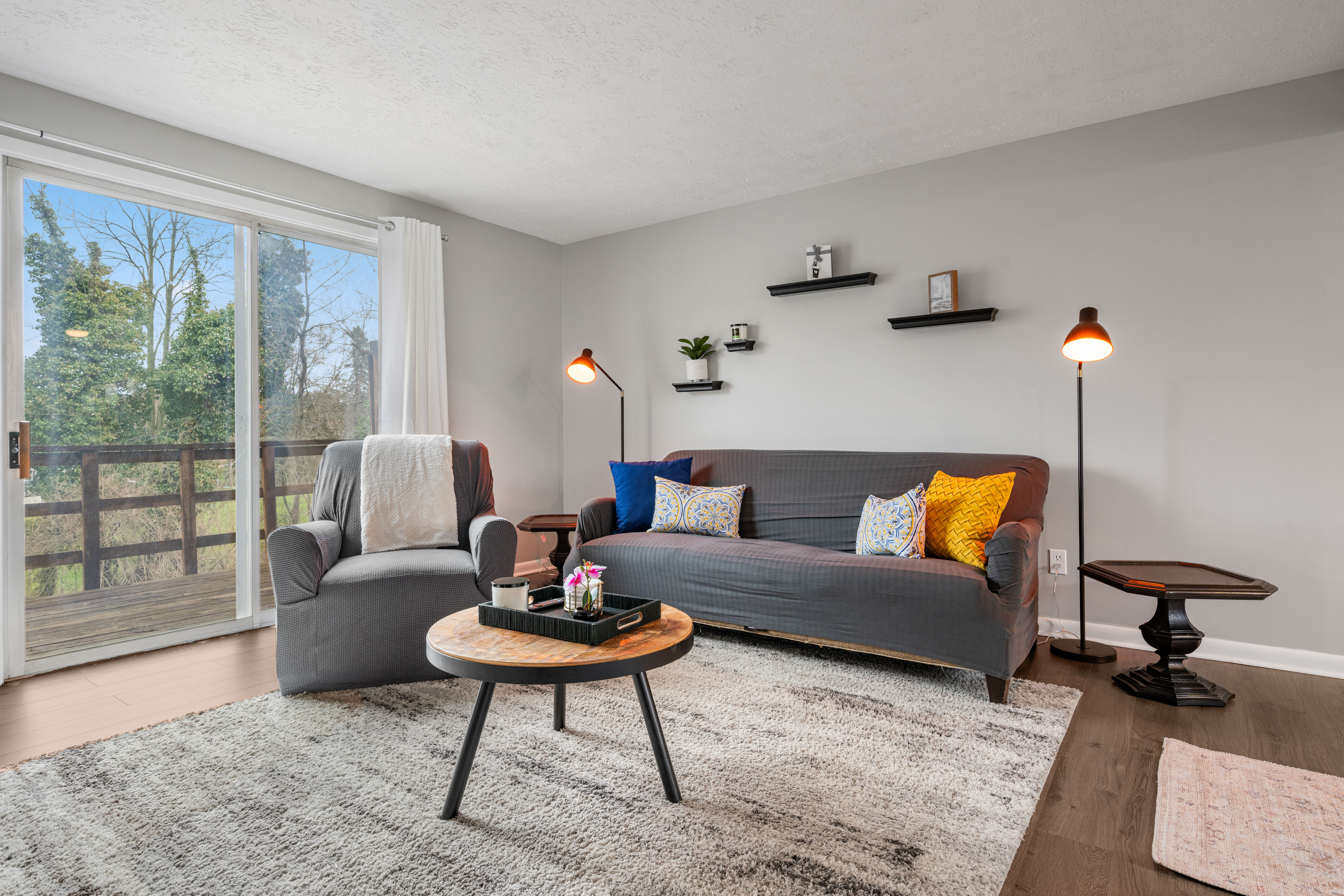 Discover the perfect blend of style and comfort at the Blue Haven Retreat. This contemporary townhouse is designed to offer a seamless, relaxing stay for your entire group. Main Living Area: A bright and tidy space filled with natural light, featuring a large flat-screen TV and a sliding glass door leading to your private deck. Second Sitting Area: An additional cozy space, also with a large flat-screen TV, allowing your group to spread out and enjoy different activities. Kitchen: A modern, fully stocked kitchen with sleek black cabinetry, ready for you to prepare everything from a quick breakfast to a gourmet dinner. Bedrooms: Two comfortable bedrooms with a total of three beds to accommodate your group. Bathrooms: 2 bathrooms, 1 full and 1 half. One features a modern, brightly colored design, while the second is a clean, utilitarian space. Dedicated Workspace: A designated area perfect for remote work or catching up on emails. Laundry: For your convenience, a private washer and dryer are available, ideal for longer stays.