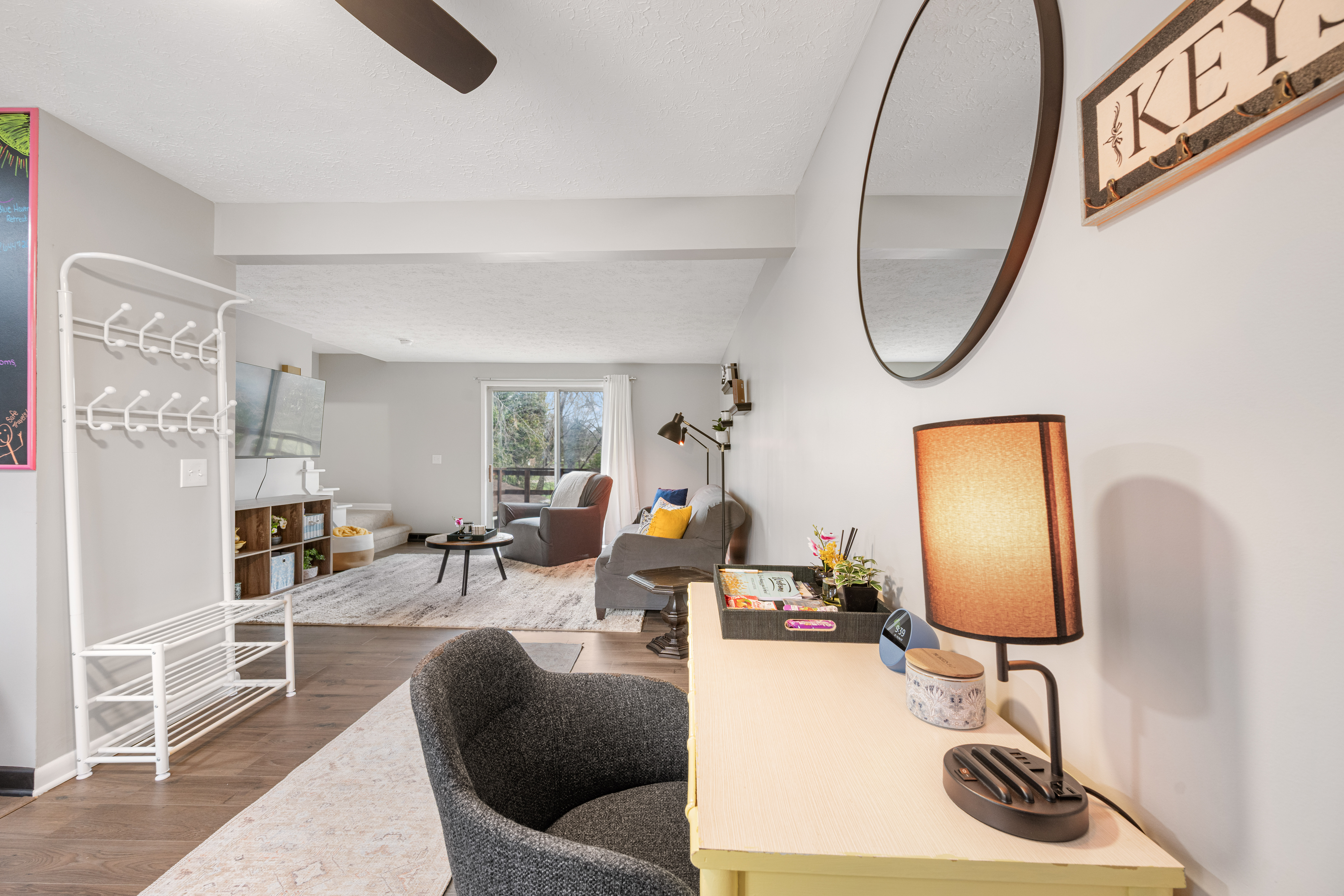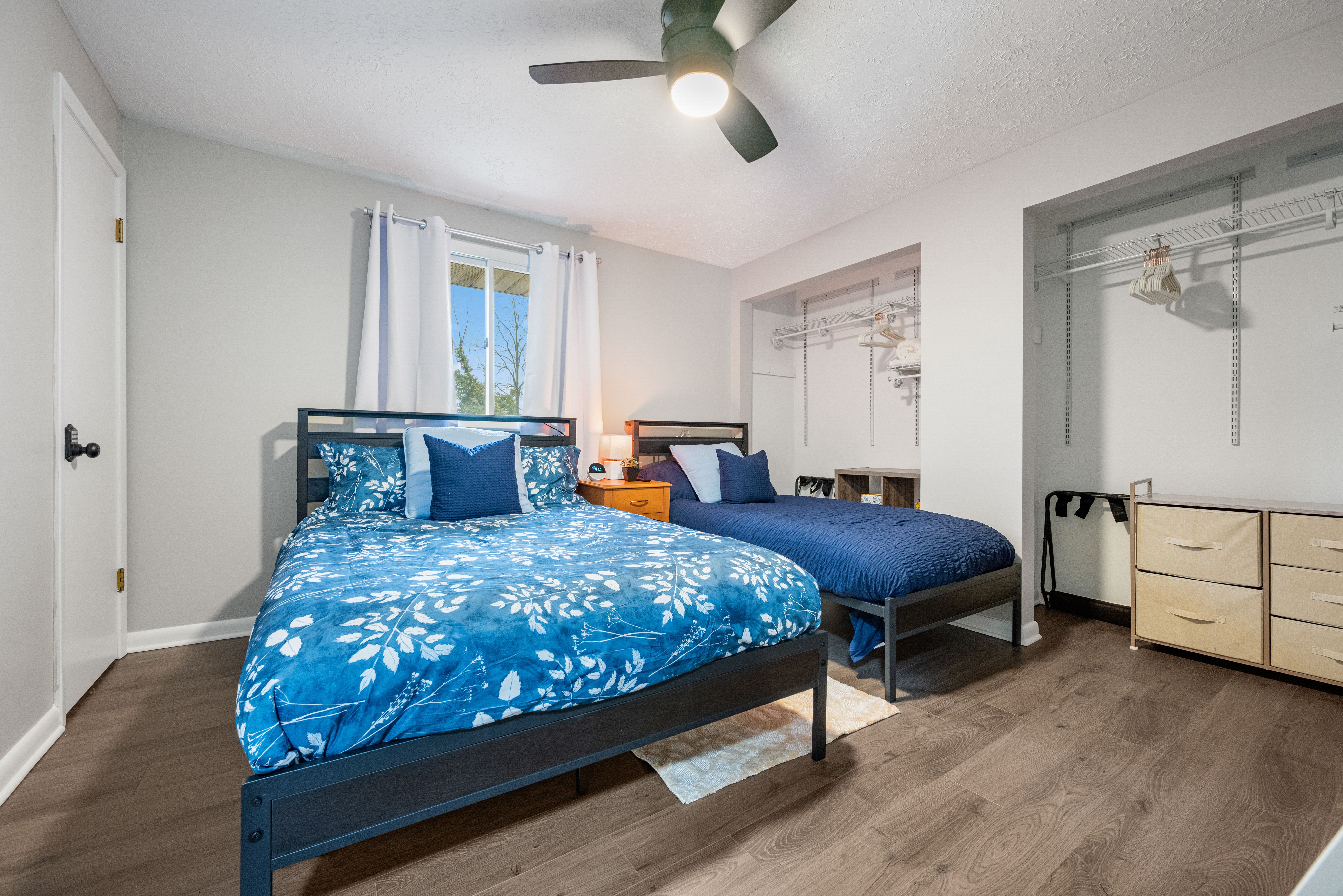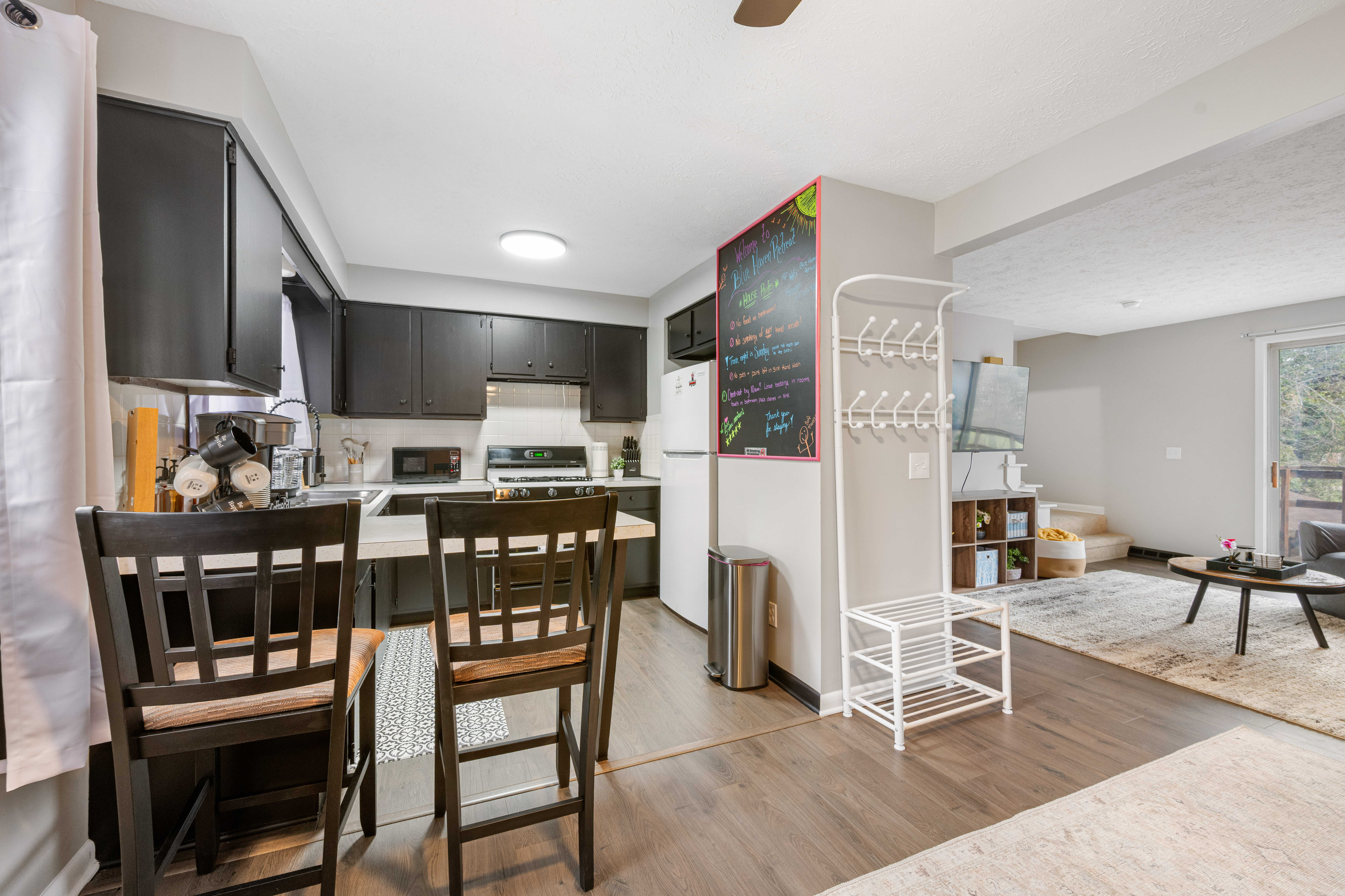Discover the perfect blend of style and comfort at the Blue Haven Retreat. This contemporary townhouse is designed to offer a seamless, relaxing stay for your entire group. Main Living Area: A bright and tidy space filled with natural light, featuring a large flat-screen TV and a sliding glass door leading to your private deck. Second Sitting Area: An additional cozy space, also with a large flat-screen TV, allowing your group to spread out and enjoy different activities. Kitchen: A modern, fully stocked kitchen with sleek black cabinetry, ready for you to prepare everything from a quick breakfast to a gourmet dinner. Bedrooms: Two comfortable bedrooms with a total of three beds to accommodate your group. Bathrooms: 2 bathrooms, 1 full and 1 half. One features a modern, brightly colored design, while the second is a clean, utilitarian space. Dedicated Workspace: A designated area perfect for remote work or catching up on emails. Laundry: For your convenience, a private washer and dryer are available, ideal for longer stays.