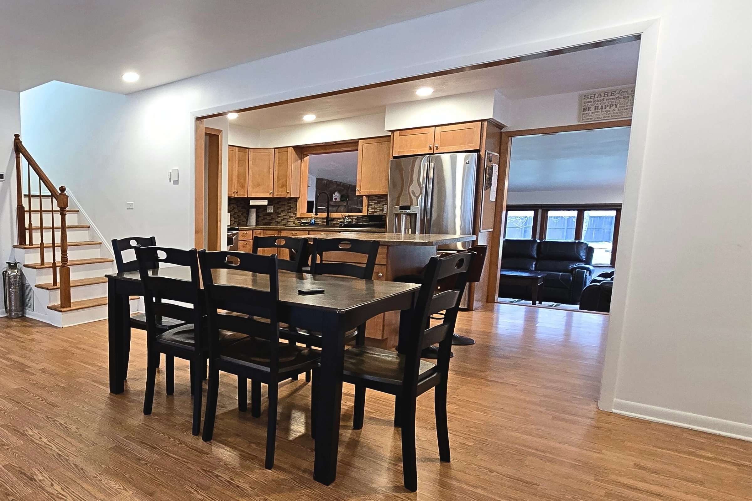 Welcome to Maple House, your quiet and spacious getaway in Vienna! This 3-bedroom, 3-bathroom home is a perfect, relaxing retreat with ample space for up to nine guests. The open-plan living area connects a welcoming dining room (seats six) to a modern, fully equipped kitchen. Kitchen features include: Stainless steel appliances Large island for prep and casual dining All the cookware you'll need for any meal A few steps down, the cozy family room invites you to unwind on plush leather couches by the warmth of the electric fireplace while watching the massive 75" TV. Large windows offer a beautiful view of the expansive backyard. Throughout the home, you'll meet 'Ziggy,' our AI Superhost! Alexa devices in the entryway, living room, and all bedrooms are ready to help you control the lights, find local restaurants, or answer questions about your stay. Sleeping Arrangements: Bedroom 1: One Queen bed and ample closet space. Bedroom 2: One Queen bed and one Twin bed. Bedroom 3: Two Queen beds, a 55" TV, and a private attached full bathroom. A second full bathroom is located in the hallway. The basement provides a third full bath, a laundry area, and a dedicated workspace perfect for remote work or study. Outside, your group will love the huge, fenced-in backyard on our one-acre lot. During the summer months, enjoy the above-ground pool and a dining porch perfect for outdoor meals.