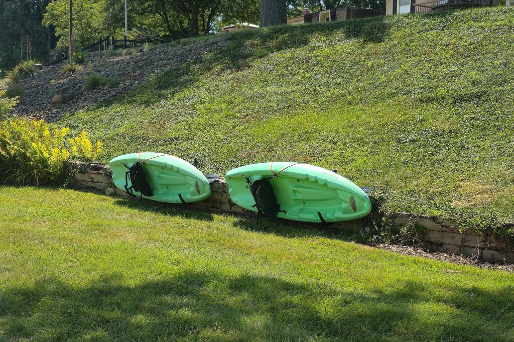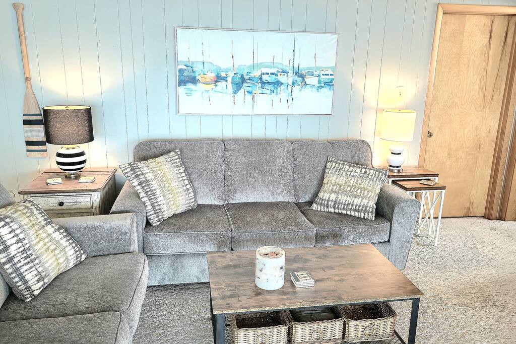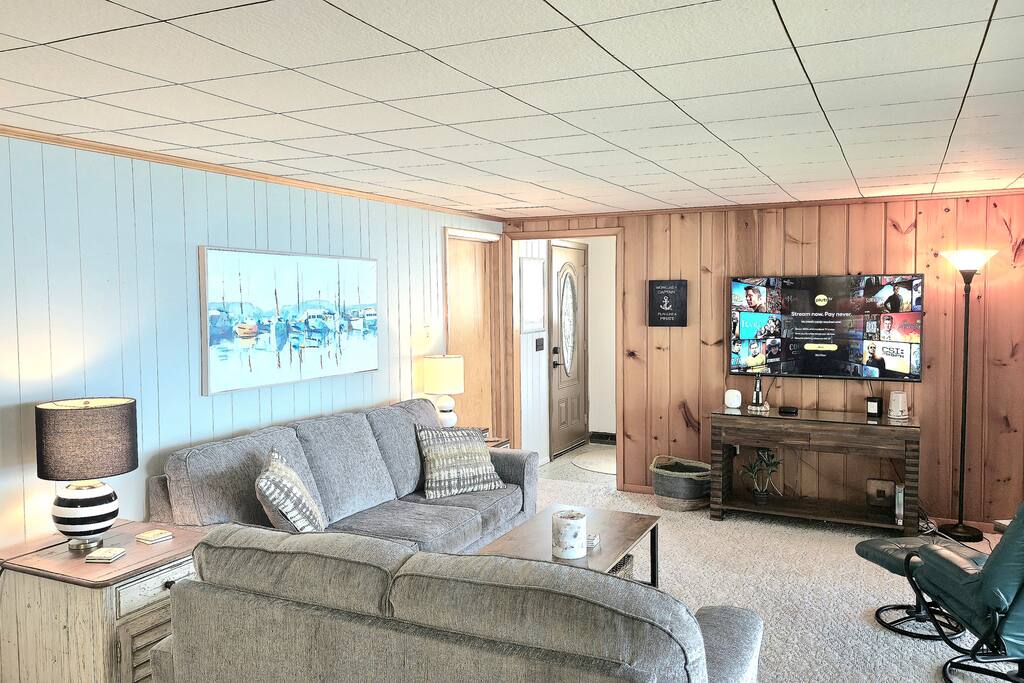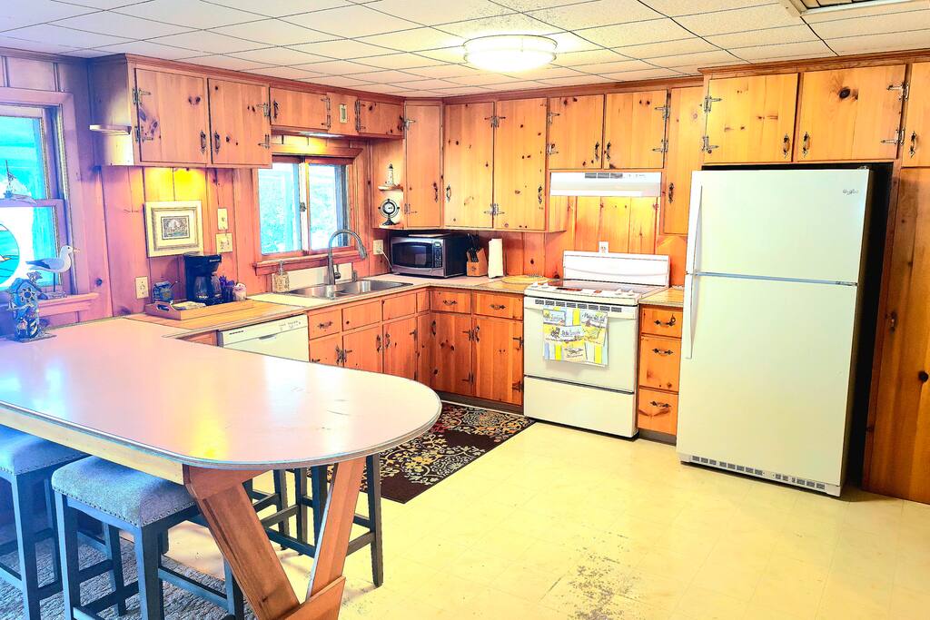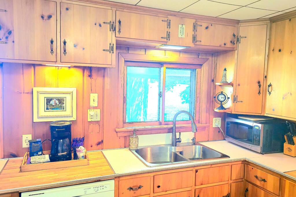 Milton's Cottage has plenty of clothing storage in both of its bedrooms. There's also a huge coat closet at the front door. Each bedroom has a queen bed. The living room features a couch, a love seat, and a recliner, and is equipped with a smart TV. You can log in to your favorite streaming service. The kitchen is fully stocked and comes with most everything you'll need to cook your favorite meals. We have a dishwasher and provide a few cleaning tabs to get you started. We also keep cleaning supplies under the sink. You are at the lake, and you may encounter spiders or other bugs as the cold months approach. Our housekeepers battle them regularly. Thank you for understanding. There are two Kayaks down by the water. If you use them, please put them back where you found them. We keep life jackets in the chest by the water. You are welcome to use them. Please return them once you're finished. There is a boat dock available for your use. It's just to the left of our pontoon boat. We have a fire pit and some chairs. You'll see it on the way down to the docks. The fire pit closest to you is the one you can use. Please return the chairs to their original position. We may have wood stacked to the right of the chairs. You're welcome to use it. If you don't see any, there are some for sale at the end of our street. We do not offer laundry services, but a laundromat is conveniently located nearby. You can use the electric grill on the back patio. Please clean it when you are done. If you need anything during your stay with us, please don't hesitate to contact us. We will do our best to accommodate you. We hope you enjoy our 1950s-style cottage.