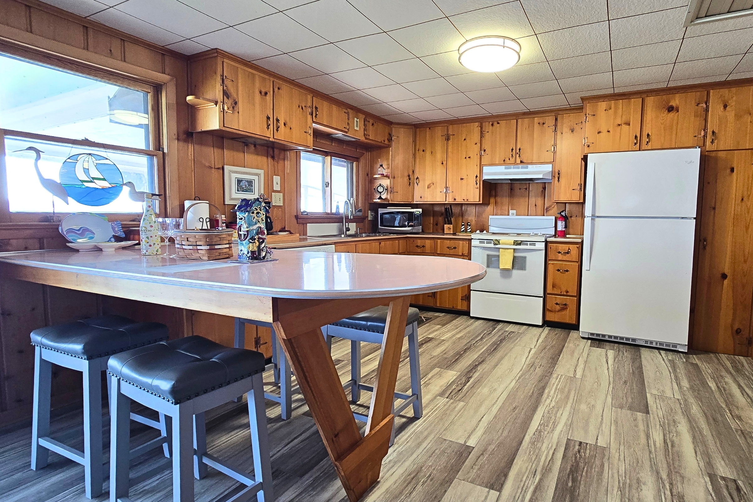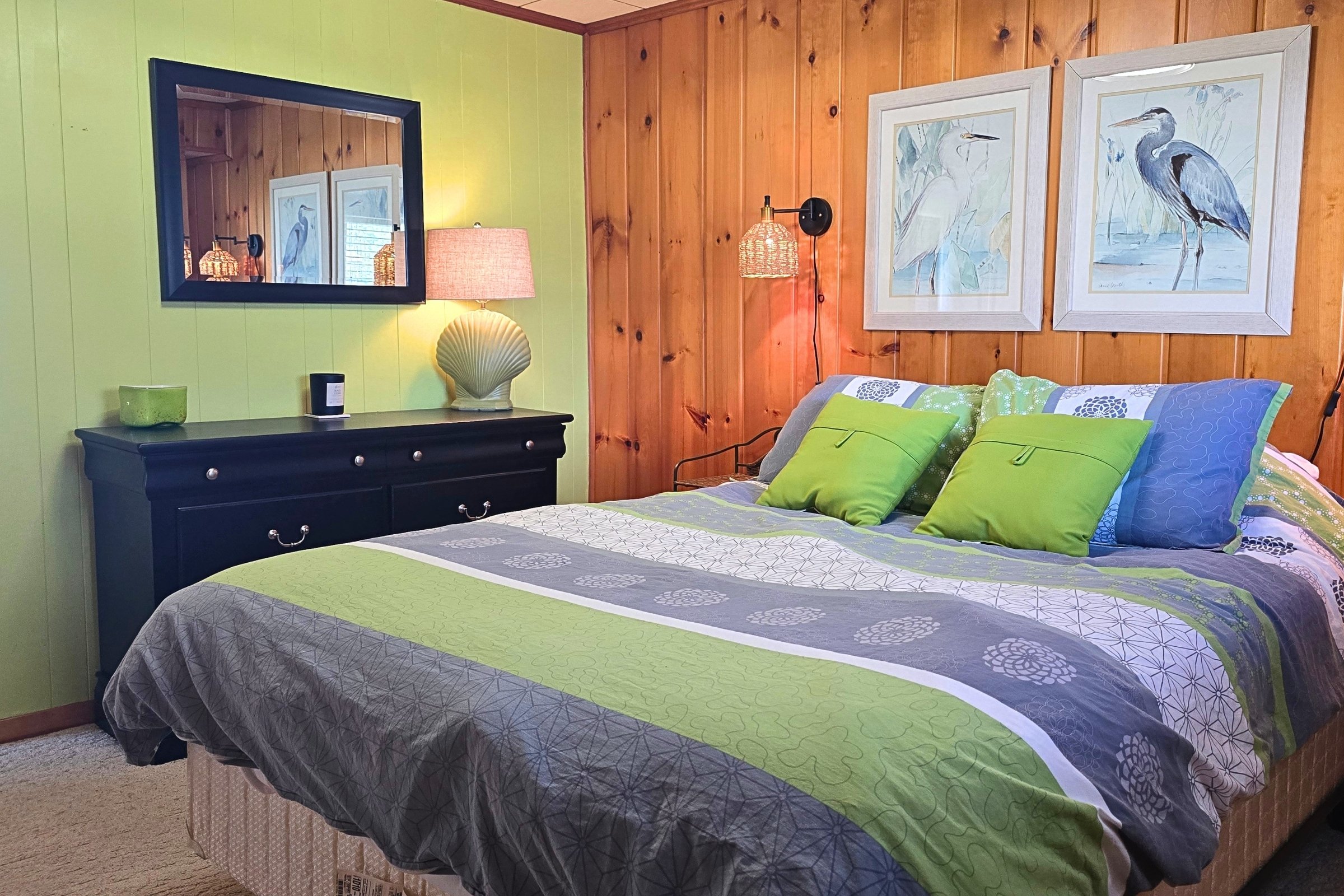 Step back in time in our rustic, wood-paneled lakeside cottage, designed for comfort and relaxation. The space is perfect for unwinding and enjoying the serene water views. Living Room: Features a cozy couch, loveseat, and recliner, perfect for relaxing with a view of the lake. A Smart TV is available for you to log into your favorite streaming services. Kitchen: A fully stocked kitchen has everything you need to prepare delicious meals, including a starter supply of dishwasher tabs. Bedrooms: The cottage includes two comfortable bedrooms, each furnished with a queen bed and ample storage for your belongings. Storage: A large coat closet is available at the front door for your gear.