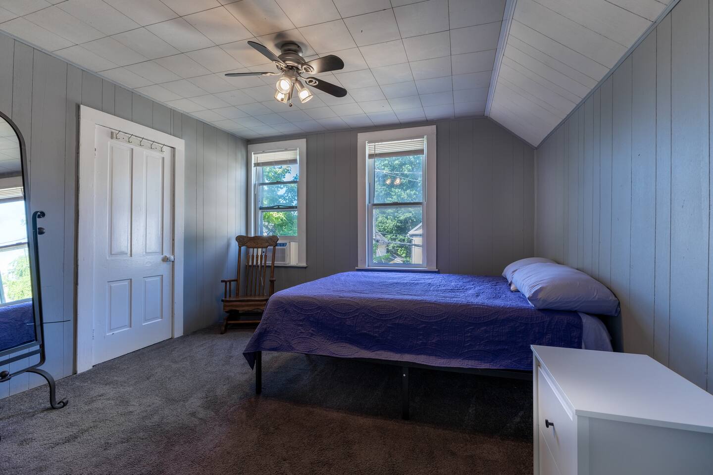 Welcome to Kling Haven, your stylish and comfortable home base in Akron! This spacious home offers a cozy, modern vibe perfect for groups. * **Living Spaces:** Unwind in the comfortable living room, gather for meals in the separate dining room, or enjoy a quiet moment in the bright, naturally lit sunroom. * **Bedrooms:** The home features five distinct bedrooms, ensuring a restful night's sleep for everyone in your group. * **Kitchen:** A fully equipped kitchen is ready for you to prepare anything from a quick breakfast to a full dinner. * **Bathrooms:** A full bathroom with a shower-tub combo and an additional half-bath provides plenty of space for everyone. * **Laundry:** A washer and dryer are available for your use in the basement.