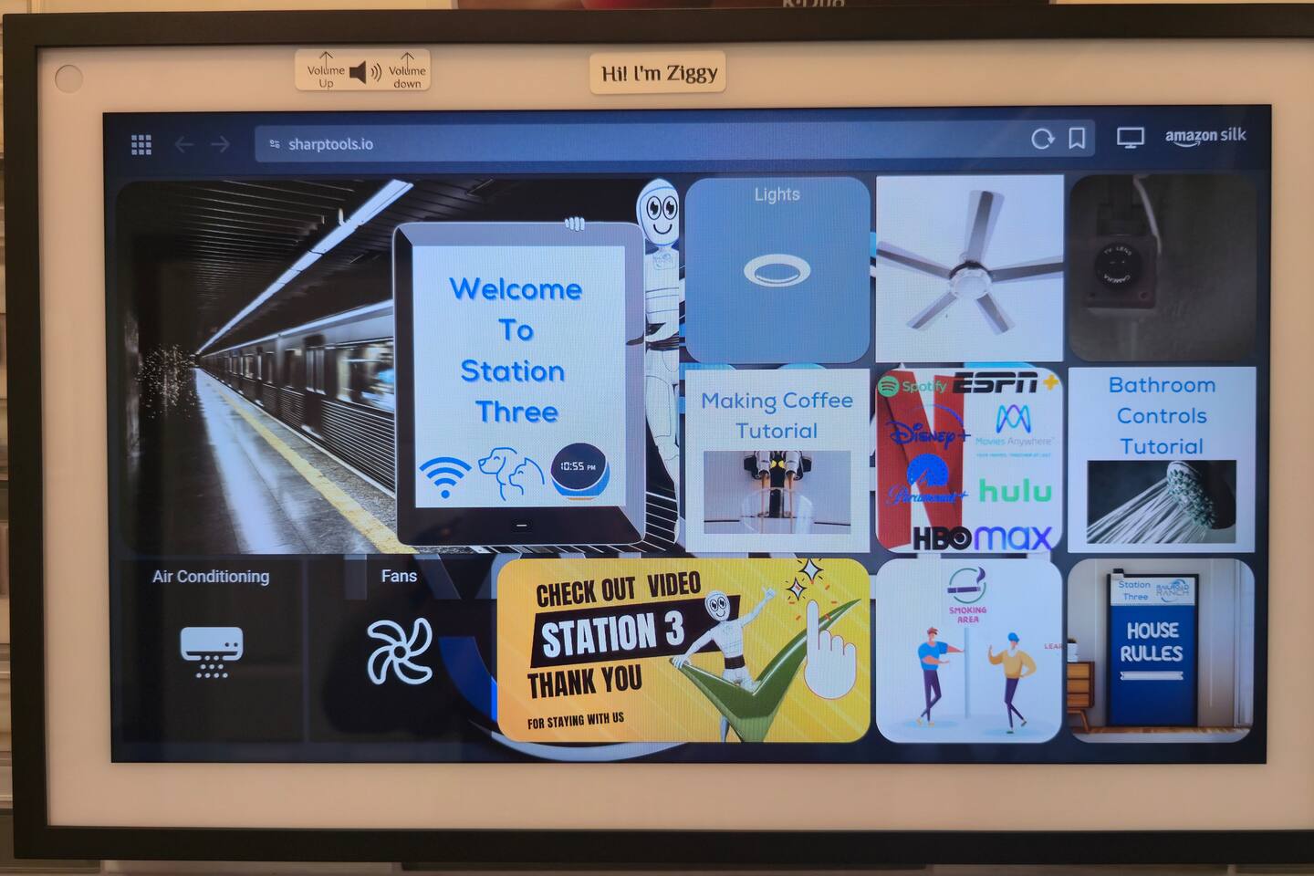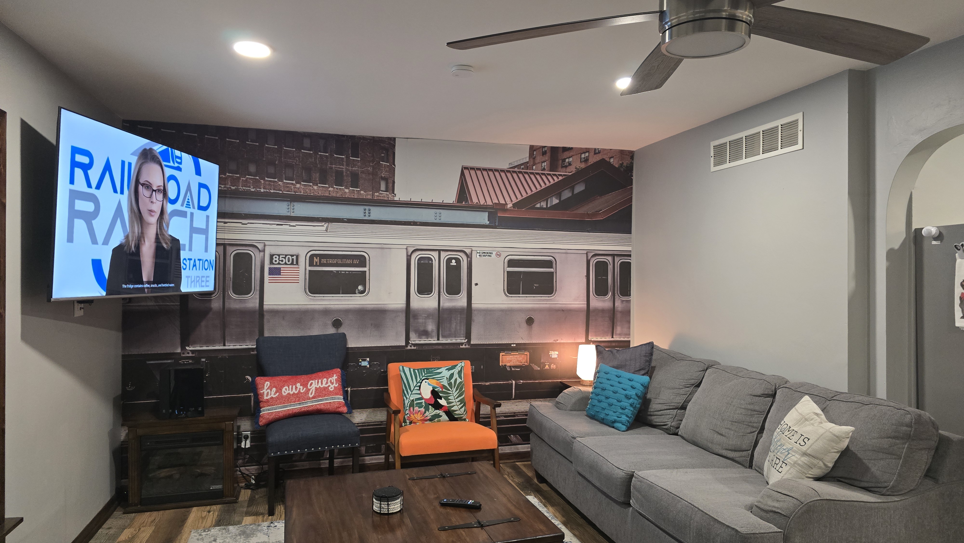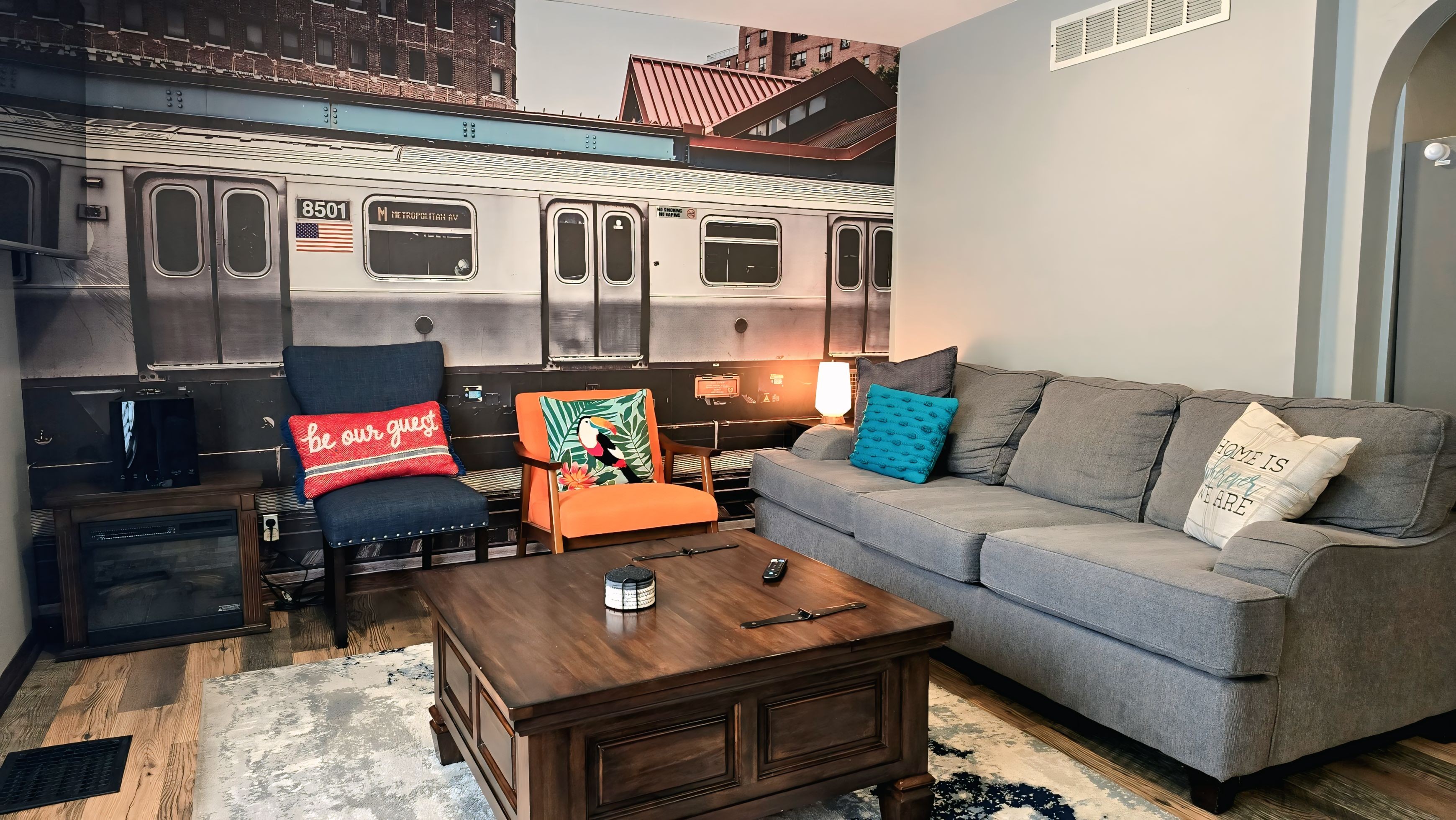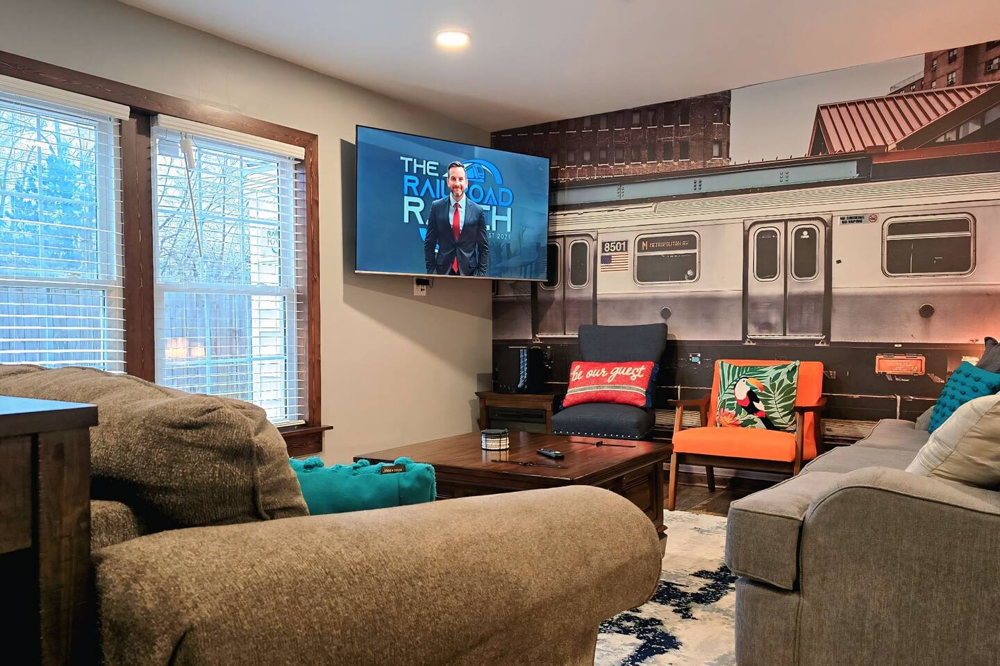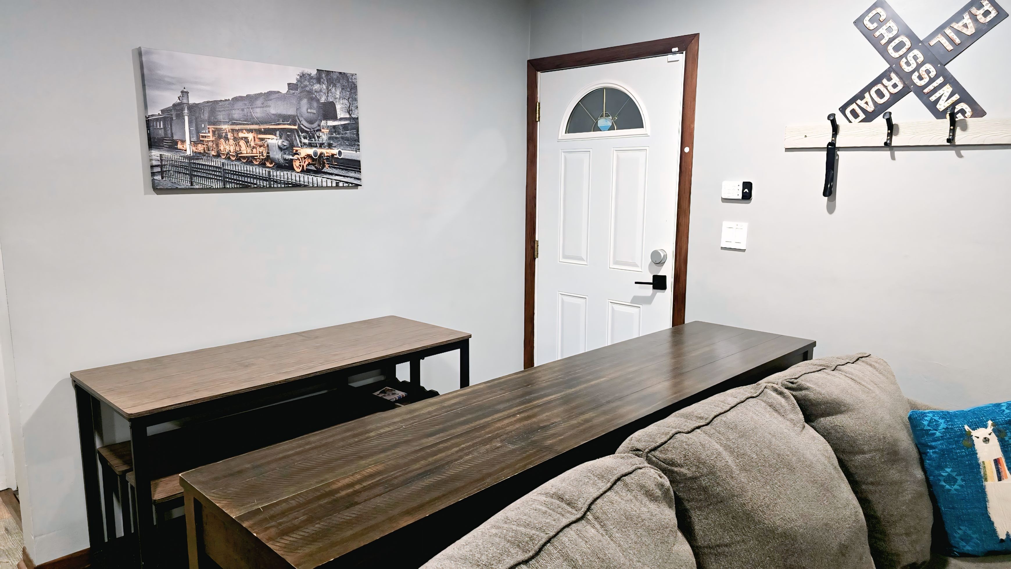 Step into Station Three, a fully automated smart home designed for a memorable, high-tech experience. Your stay is managed by Ziggy, our friendly A.I. butler. The space comfortably accommodates 4 guests, with room for up to 6. Key Features: Smart Home Experience: Control your environment with an Echo Show 15 in the kitchen, view outdoor security cameras on your TV, and set custom lighting and climate scenes with ease. Modern Comfort & Design: The living area features a captivating train mural. The kitchen is fully stocked for all your culinary needs. Restful Sleep: Bedrooms are equipped with premium 12-inch memory foam beds for ultimate comfort. Advanced Health & Safety: Our home utilizes NASA-based air purification technology, proven to reduce airborne viruses (including SARS-CoV-2) by 99.9% in 60 seconds and sterilize hard surfaces. Superior Connectivity: Enjoy lightning-fast Wi-Fi and ethernet connections, perfect for remote work or streaming.