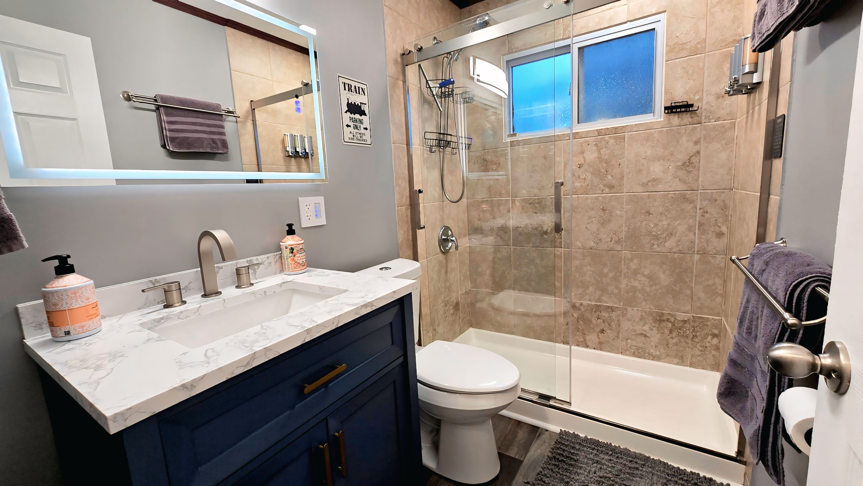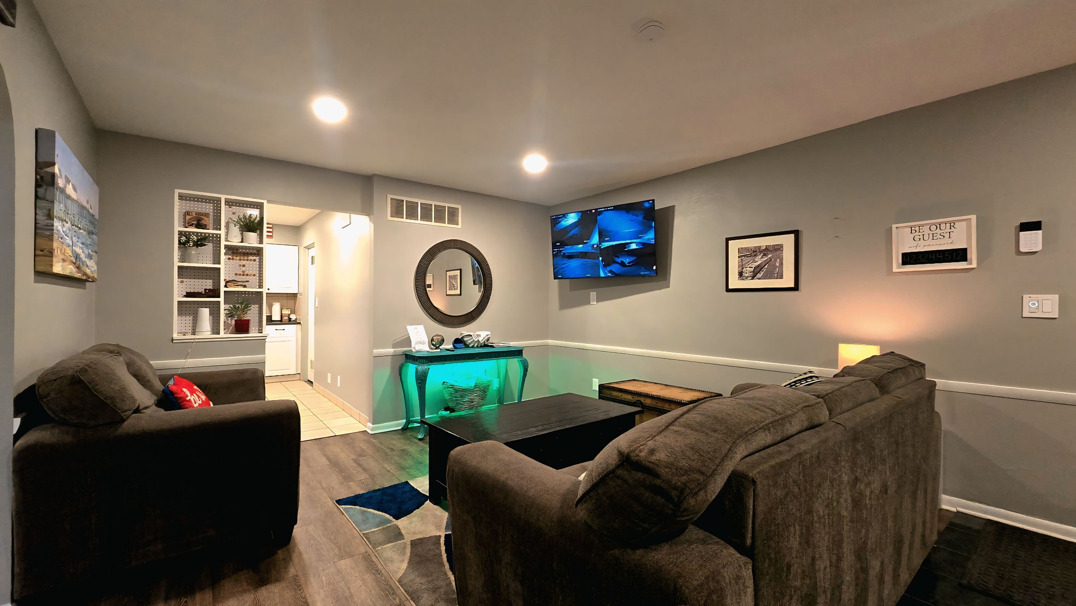 All aboard Station 5! This unique single-level retreat combines two homes into one haven for large groups. Enjoy a train-themed stay with a Level 2 EV Charger, 2 fully stocked kitchens, and 2 living rooms. Perfect for multi-gen families, we offer a "together yet private" layout with 5 bedrooms and a dedicated workspace. Features include smart home tech, air purification, and a BBQ grill. Pet-friendly and zero-step accessible! Station 5 is your perfect platform for adventure.