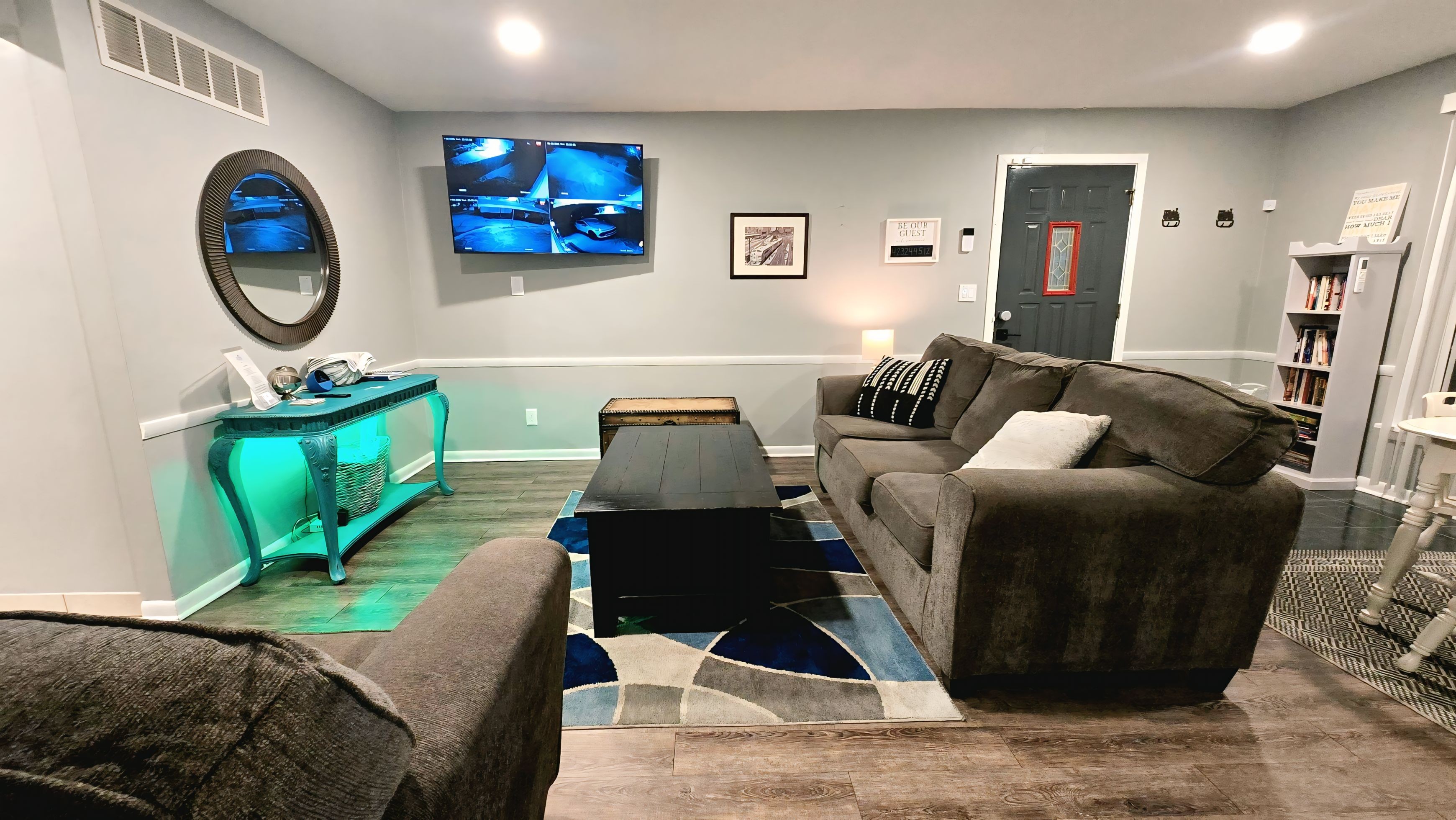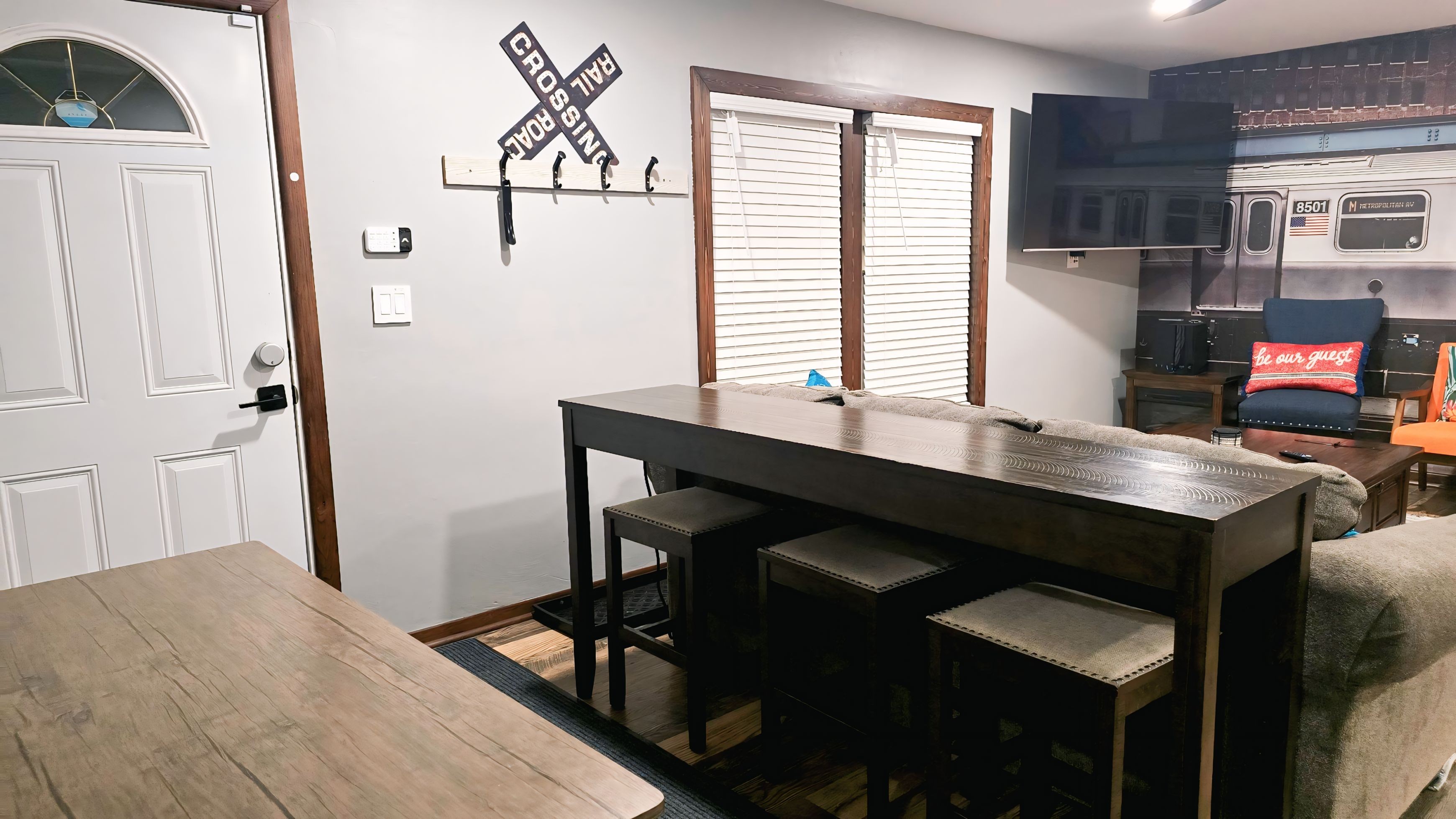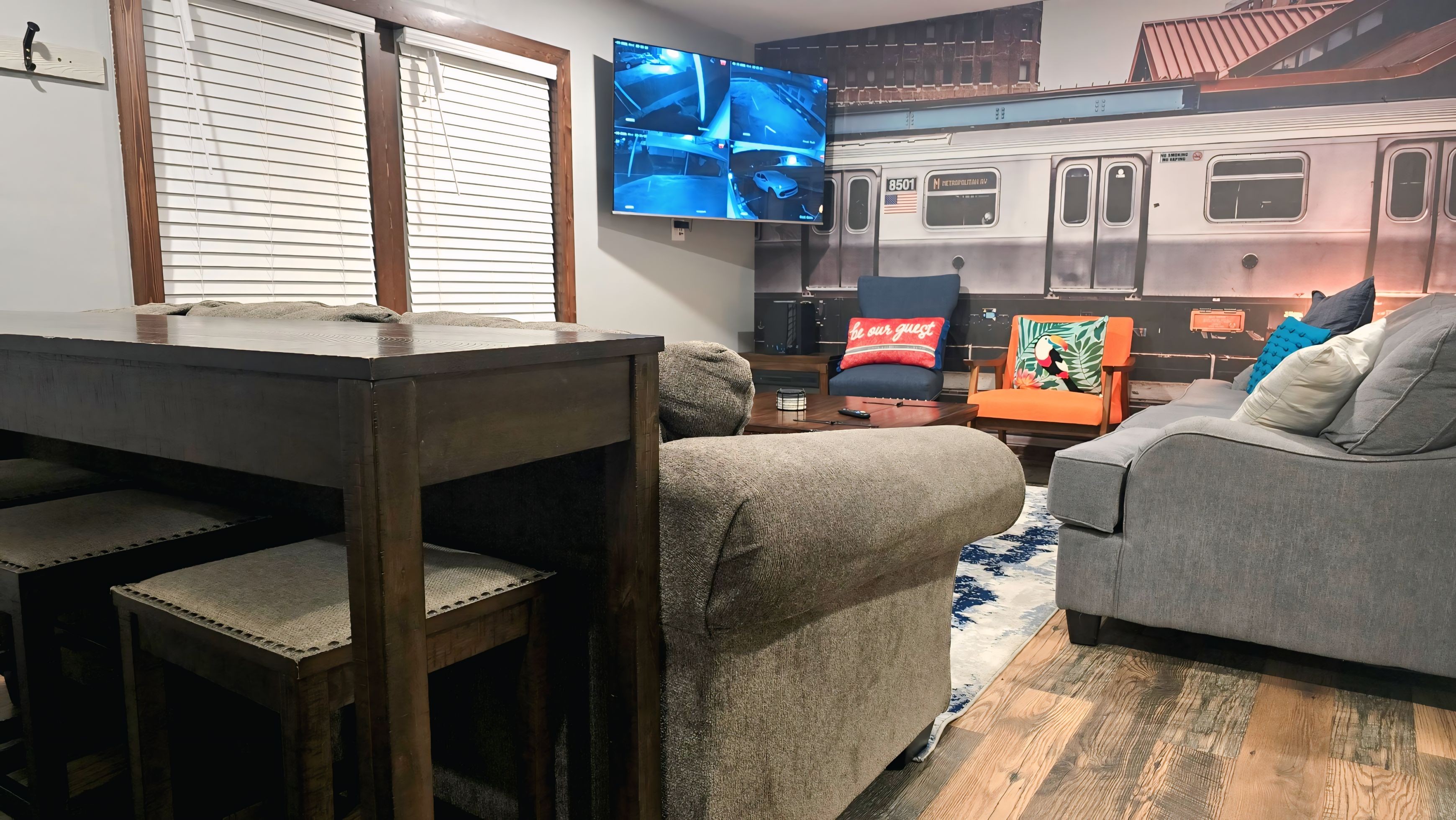 Experience the best of traveling together with the privacy of your own space. Station 5 is comprised of two side-by-side, complete homes on a single floor, connected by a convenient pass-through door. With no stairs, this ranch-style property is easily accessible for everyone in your group. This expansive layout includes: Two separate living rooms, one featuring a stunning, wall-sized train mural. Two fully stocked kitchens. One features modern stainless steel appliances and granite-style countertops, and both are equipped for preparing large meals. Two full bathrooms. Two laundry rooms. A smart home system with voice assistants (and traditional switches). Living room TV with HDMI and ethernet connections for computers or gaming consoles. Bedrooms: Your group will have plenty of room to rest across five comfortable bedrooms: Bedroom 1: Queen Bed Bedroom 2: Queen Bed Bedroom 3: Full Bed Bedroom 4: Full Bed Bedroom 5: Full Bed & Twin Bed