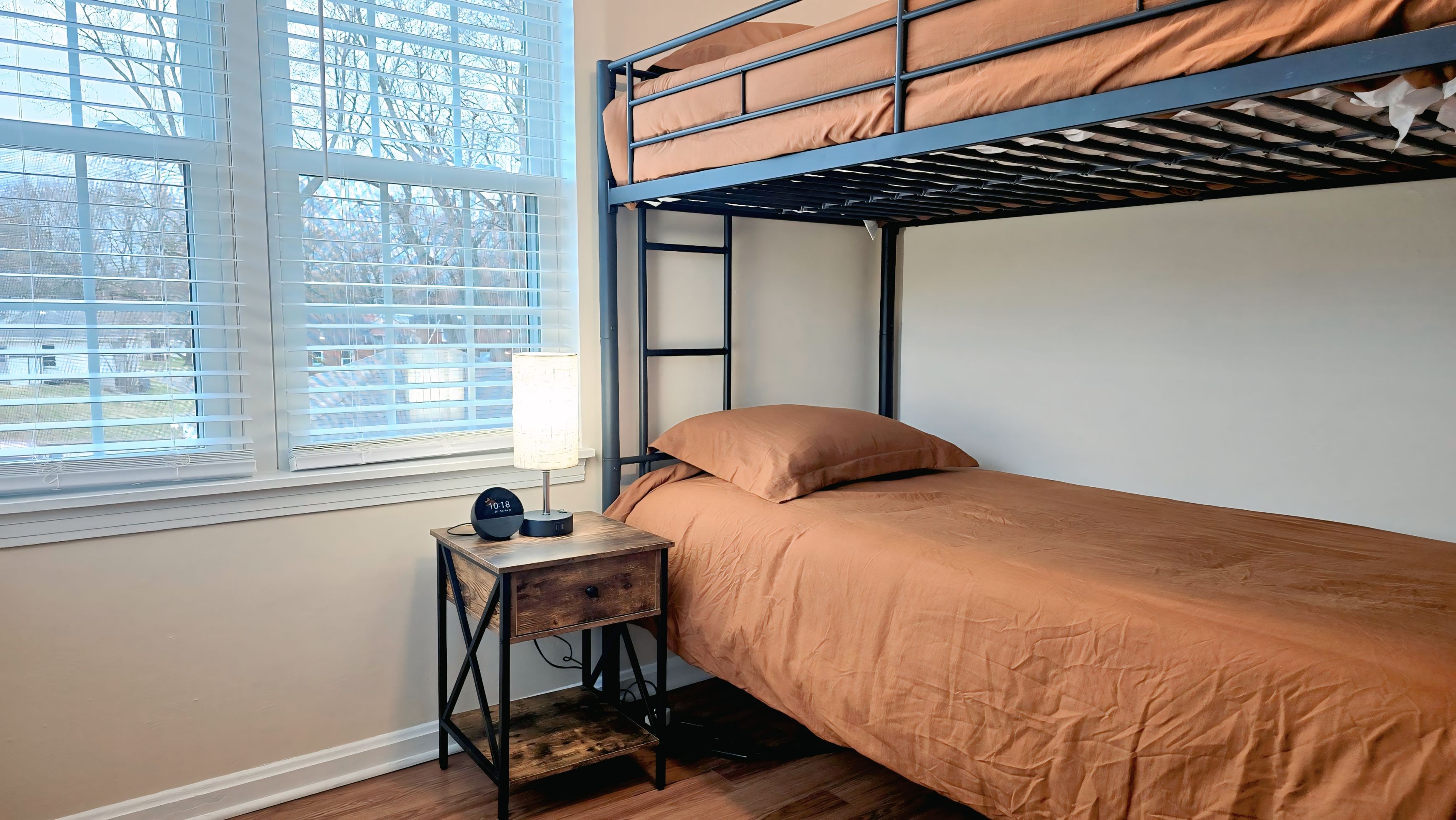 Welcome to your modern smart home away from home! This newly renovated 2-story brick townhouse combines stylish finishes with the latest tech for a truly seamless stay. Sunlight fills the open-plan living area, highlighting the warm hardwood floors and inviting you to relax. Effortlessly enhance your stay using the Alexa smart devices in the living room and both bedrooms. You can set the mood with your favorite music, get local recommendations, or simply unwind in a space that responds to your needs. Sleeping Arrangements (2nd Floor): Bedroom 1 features a private and comfortable Queen bed. Bedroom 2 features a set of Twin bunk beds, making it perfect for families or extra guests. Bathroom: A full bathroom is conveniently located on the second floor, stocked with essentials for your arrival. Kitchen & Dining: Your modern, fully equipped kitchen has everything you need to whip up delicious meals. Gather around the dining table for four, or enjoy the bonus dining area located in the basement.